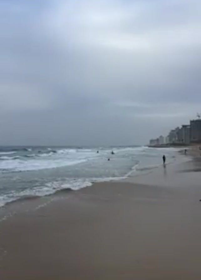 The video captures a beach scene on a cloudy day
