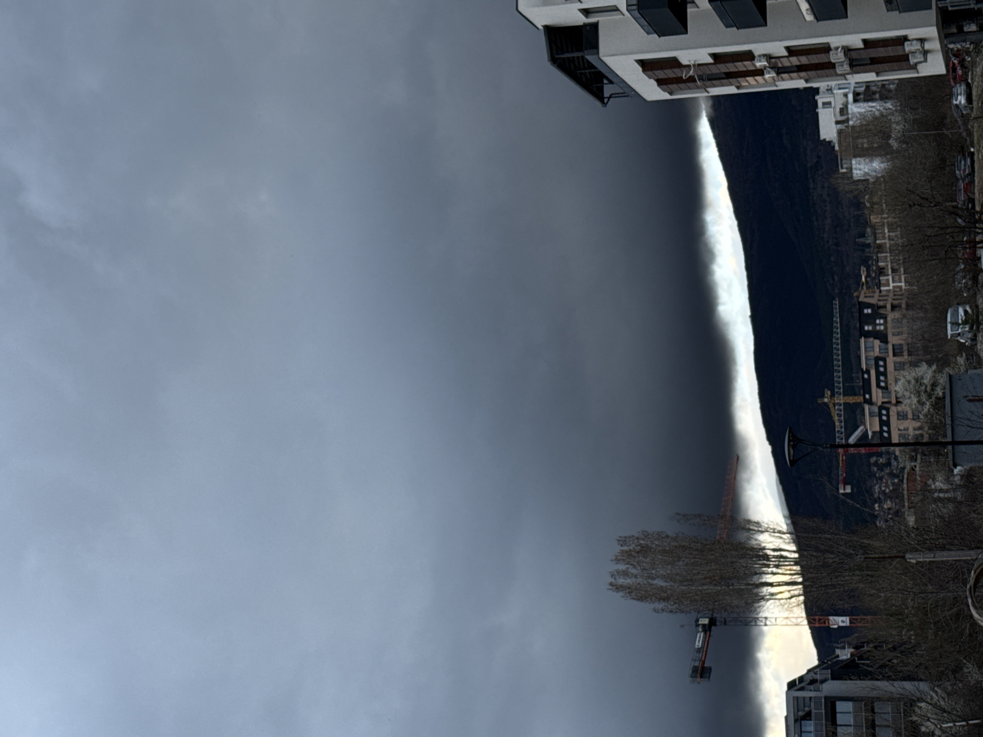 sky filled with thick gray clouds. The right side of the image reveals a mountain range with a distinct line of sunlight breaking through the clouds and illuminating the peak. Below the mountain are buildings and a few construction cranes. At the top of the image, there is a section of a white building with dark windows and balconies. There are trees along the right side, which appear to be bare, indicating a winter or early spring season. The scene appears to be in an urban environment.