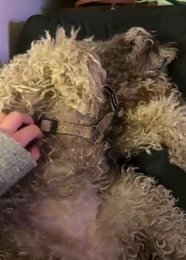 A person is seen petting a furry, curly-haired dog that is lying on its back on a dark couch. The dog is wearing a patterned collar with small embellishments. The person's hand, wearing a grey sweater sleeve, gently strokes the dog's belly and chest area. In the background, there is audible speech and music.