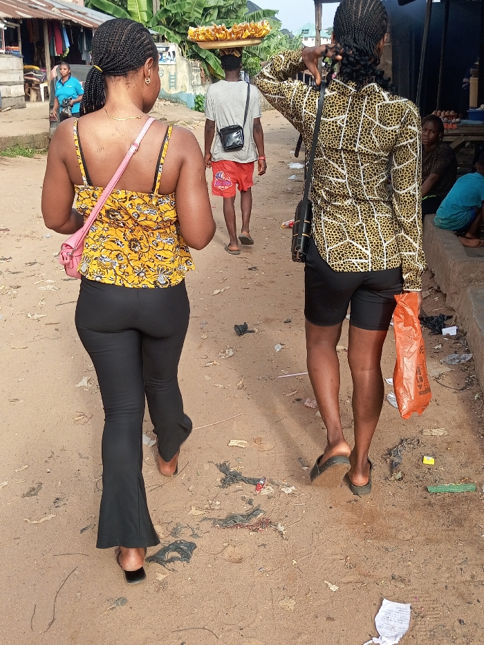 The image captures a street scene in Onitsha, Nigeria, featuring multiple individuals on a dirt path with roadside market activity. In the immediate foreground, facing away from the viewer, a woman with braided hair, wearing a yellow, black, and white patterned spaghetti strap top, form-fitting black flared trousers, and dark open-toe heels, walks leftward. She carries a small pink shoulder bag. To her right, another person with braided hair, wearing a long-sleeved yellow and black patterned shirt, black shorts, and dark slides, walks forward, carrying a black shoulder bag and an orange plastic bag in their left hand. Their right arm is slightly raised. In the mid-ground, directly ahead of the first two individuals, a male vendor walks, also facing away from the viewer. He wears a light grey short-sleeved t-shirt, red patterned shorts, and light-colored flip-flops. He balances a large, round, flat tray filled with numerous small, light-colored food items on his head. The ground is an uneven reddish-brown dirt surface, scattered with various debris including black plastic bags, paper, and other refuse. Along the left side of the path, obscured by the foreground individuals, are simple structures consistent with market stalls or shops, one displaying clothing. In the background on the left, a woman in a light blue polo shirt is partially visible near these stalls. On the right side of the path, a low concrete ledge or platform is present, where a woman and a child are seated. A surface in front of them displays items, possibly eggs, indicating another market stall. Green foliage is visible beyond the structures in the mid-background, along with a light blue building and distant, indistinct urban structures under bright daylight conditions.