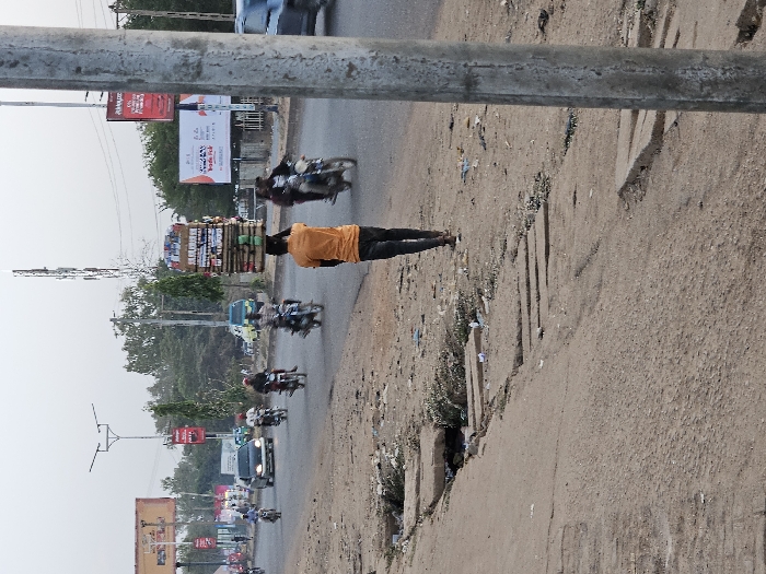 A street scene features a person balancing a tall stack of goods on their head while walking on the side of a busy road. Motorbikes and cars drive on the road, and billboards are visible in the background. The streetscape includes a concrete barrier alongside the road, and a weathered lamppost stands to the side. The scene suggests a bustling, developing urban environment.
