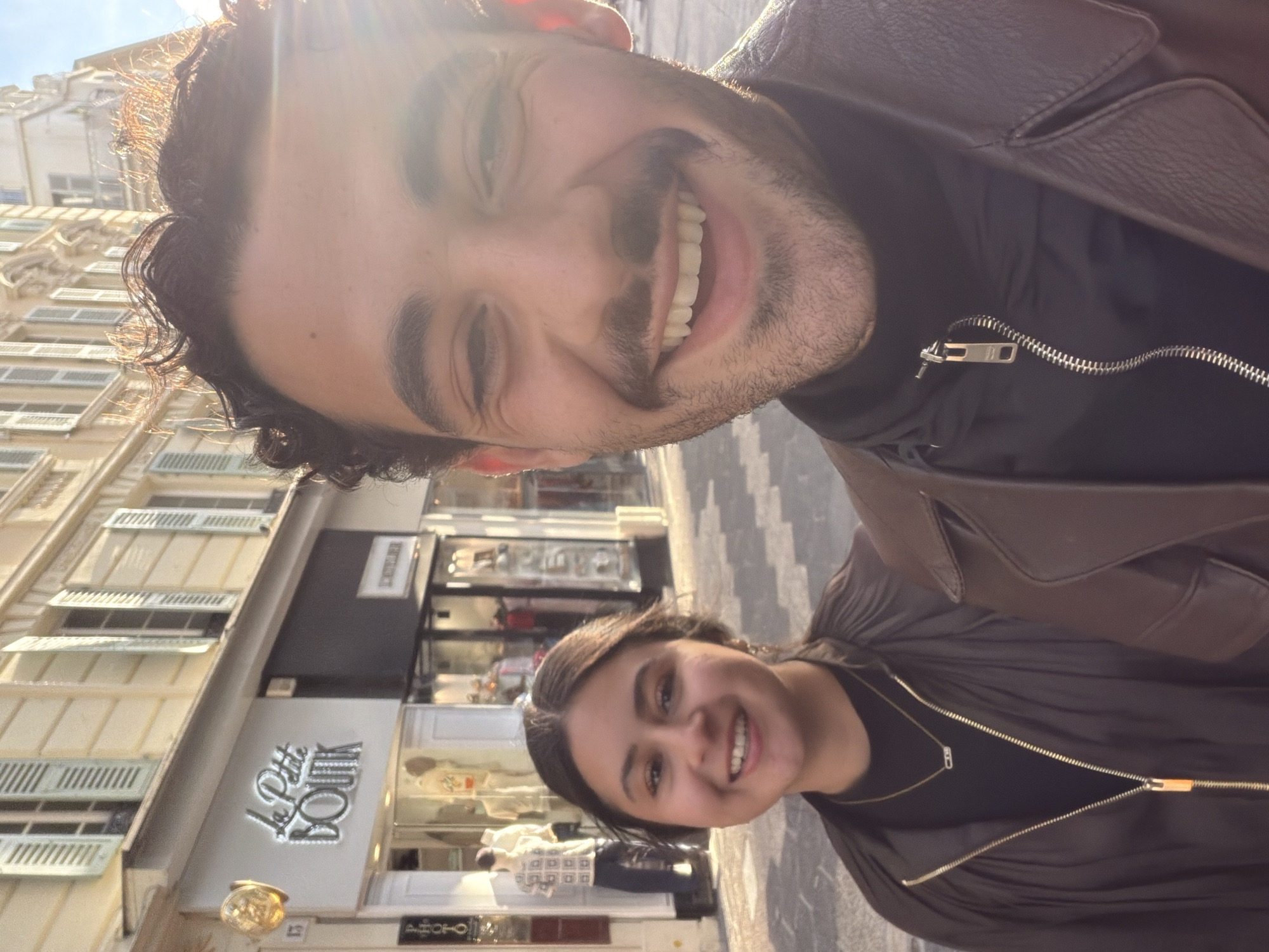 A selfie-style photograph captures two smiling individuals on a city street in Nice, France, specifically 5 Rue Massena. In the foreground on the right, a male with dark curly hair, a mustache, and stubble wears a dark brown jacket over a black zipped top, smiling broadly at the camera. To his left and slightly behind, a female with dark hair and dark eyes wears a dark, possibly pleated or ruched, zipped top and a gold chain with an elongated pendant, also smiling directly at the camera. The background features light-colored, multi-story buildings with louvered shutters on the windows. A shop named "La Petite BOUTIK" with illuminated lettering is visible behind the female, showcasing mannequins in its window. Strong sunlight from the upper right creates a lens flare and highlights the male's hair, casting shadows consistent with a bright outdoor setting.