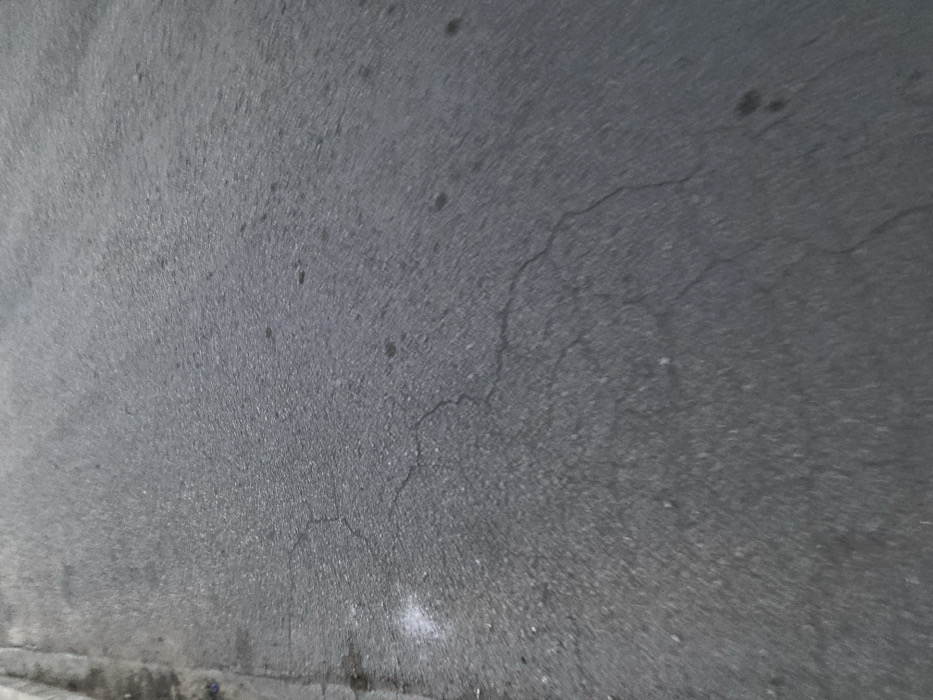 The image depicts a section of weathered asphalt pavement in the city of Kerker, Tunisia. The surface is primarily dark gray with visible light gray aggregate, indicative of a typical road or ground surface. Multiple linear cracks, varying in length and depth, traverse the asphalt, suggesting age or wear. Several irregular dark stains, possibly from liquids such as oil or water, are scattered across the pavement. Along the left edge of the frame, a lighter gray concrete curb is visible, demarcating the edge of the asphalt. A small, irregular white patch of material rests on the asphalt near the curb, approximately one-quarter up from the bottom left. No individuals, vehicles, or specific objects beyond the described surface features are present. The scene is static, capturing only the texture and condition of the ground environment.