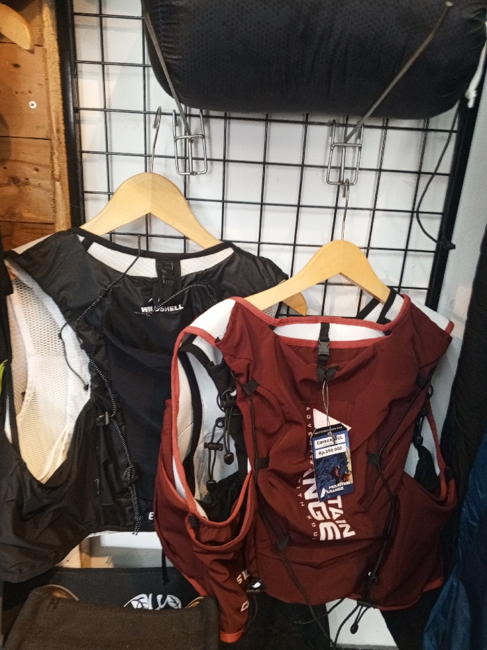 Two lightweight vests are displayed on a black wire grid wall, likely in a retail setting. On the left, a black vest with white mesh side panels and "WINDSHELL" branding is suspended from a light wooden hanger. On the right, a reddish-brown vest with a white collar trim is also on a light wooden hanger. This vest has a price tag attached, reading "Carex 10L", "Rp 250.000", and "MOUNTAIN RANGE ADVENTURE WITH". Both vests feature multiple pockets and elastic bungee cords for adjustment or storage. Above the vests, a dark, textured, cylindrical object is horizontally secured to the grid wall by metal clips. A vertical wooden panel is visible on the far left of the frame.