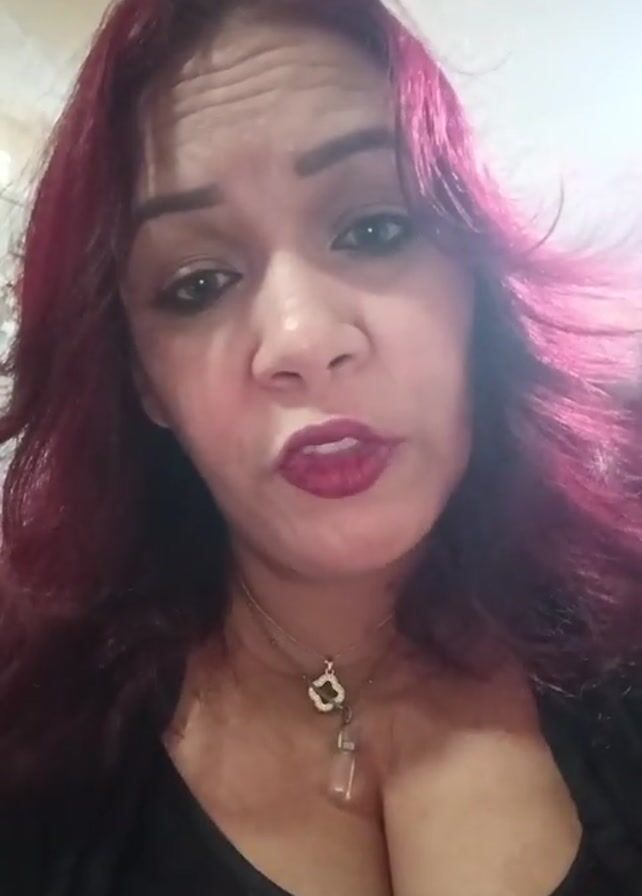 A woman with red hair, wearing a black top and a necklace with a decorative pendant, is seen in a close-up selfie video