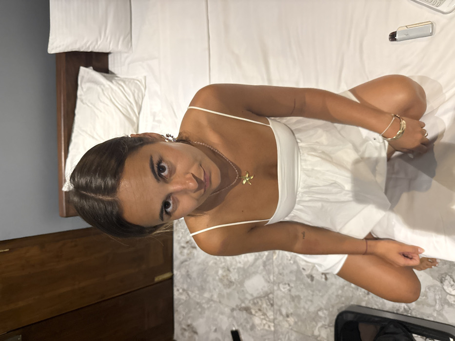 A young woman with brown hair and eyes looks up at the camera, kneeling on a bed in a white dress. She wears a delicate necklace with a dragonfly pendant. Her left arm has a small tattoo and a thin red string tied around her wrist, while her right wrist is adorned with gold bangles. The background features a bed with white linens, a wooden dresser, and a marble-tiled floor. A vape pen sits on the bed near her right side.