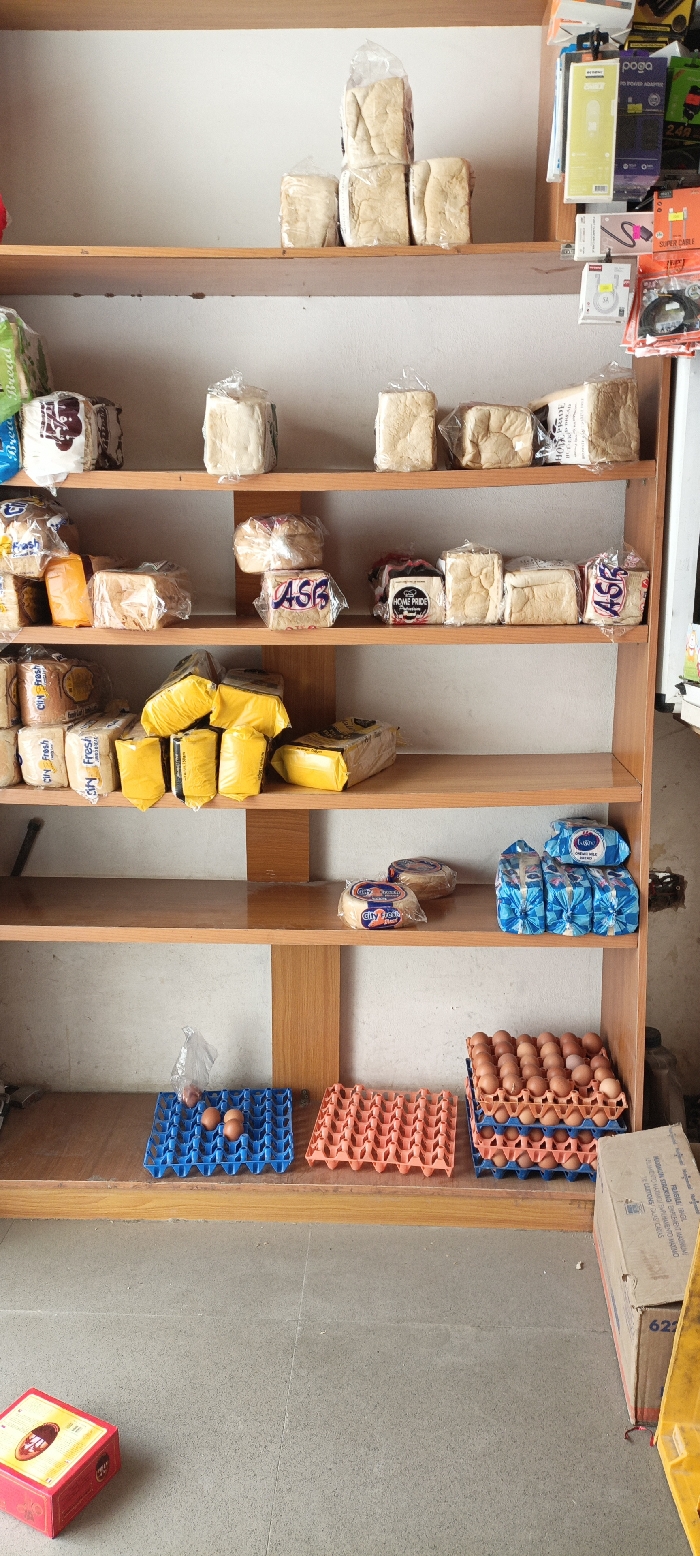 A wooden shelf displays assorted food items. The top shelf holds wrapped bread loaves and electronics. The next shelves down contain more wrapped bread, various brands visible. Underneath, there are City Fresh bread and wrapped yellow loaves. The subsequent shelf features City Fresh bread and packages of blue wrapped products. The bottom shelf showcases eggs in blue and orange containers, with some bare eggs and boxes on the floor.