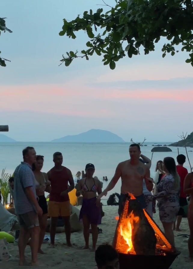 A group of people are gathered around a bonfire on a beach at dusk. The sky is a soft pink and blue. The bonfire is contained in a metal container. Some of the people are dancing, while others are standing around talking. In the background, there is a sign that says "Simple Beach" in neon lights. There is also a tree branch with green leaves hanging over the scene. In the far background, there is an island on the horizon. The people are dressed in beach attire, such as swimsuits and shorts. The camera pans out to show a wider view of the beach and the ocean.