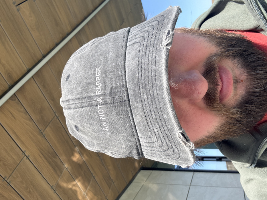 The image displays a close-up, chest-up view of an individual located in Zelenogorske silske poselennya, Ukraine. The subject, identifiable by a thick, dark beard covering the lower face, is wearing a distressed, dark grey baseball cap. The cap's brim is frayed and torn, and white embroidered capital letters on the front read "I AM NOT A RAPPER." The cap is pulled low, obscuring the individual's eyes and forehead. Visible facial features include the nose, which exhibits minor skin irregularities on the bridge, and closed lips. The individual is dressed in a dark olive green or grey zippered fleece jacket worn over a red garment. The background reveals an outdoor setting under bright daylight, with a wooden plank ceiling or overhang visible above the subject's head, and a clear blue sky to the right. A light-colored building facade is partially visible on the left side of the frame. No other individuals or direct interactions are present.