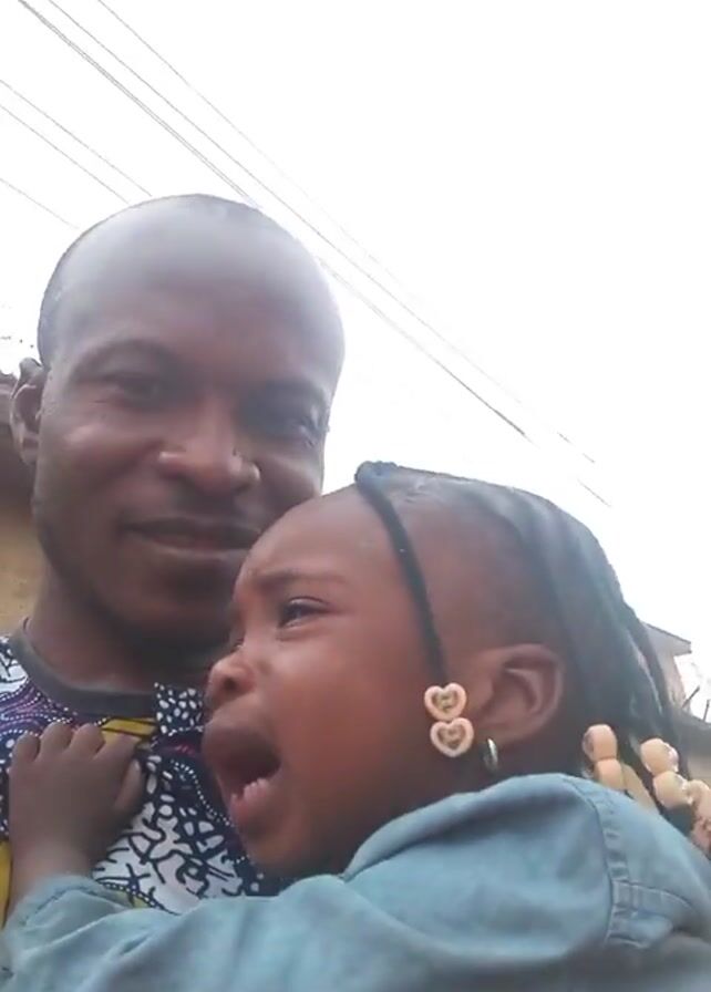 A man in a patterned yellow and blue shirt holds a crying child in his arms. The child, wearing a blue shirt and beaded braids, looks upset. The man smiles faintly. A white cloth briefly covers the lens. The setting appears to be outdoors, possibly near a building with barbed wire visible in the background. Overhead wires are also visible.