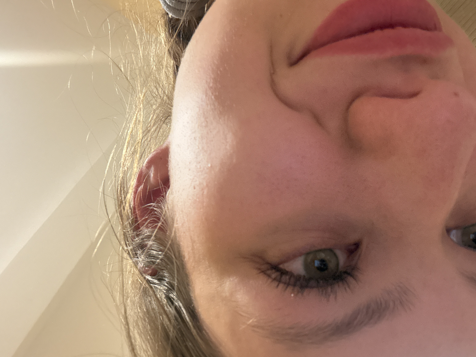 close-up of a woman's face from a low angle. Her skin appears fair, with visible pores and fine lines. She has green eyes and light brown hair. Her lips are pink and full. The background is blurry and light-colored. The location is not discernible from the image.