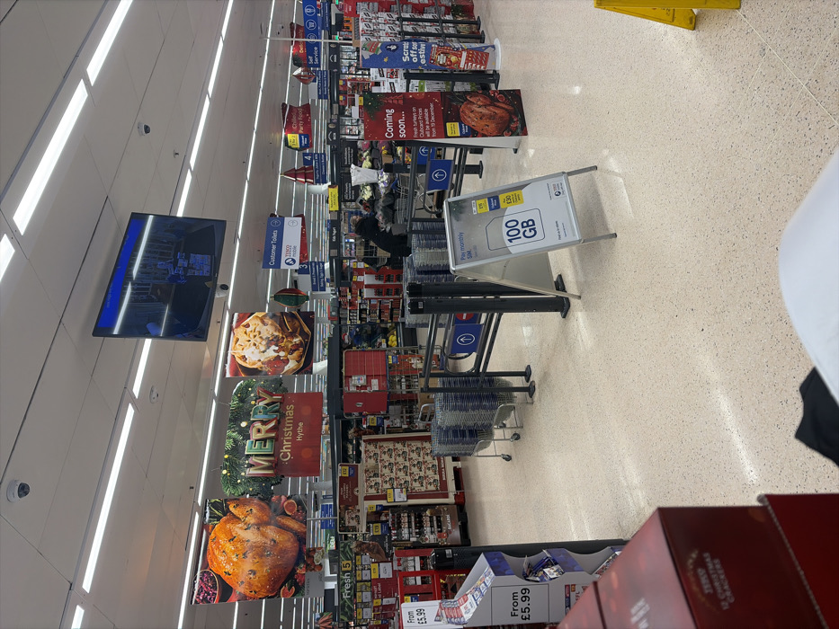 A supermarket aisle is decorated with Christmas-themed promotional materials. Hanging signs feature festive imagery like a roasted turkey and "Merry Christmas Hythe." Below these, shelves are stocked with various products, including Christmas crackers. A sign advertises a "Coming soon" offer for fresh turkeys and "Self Service" options. Another sign displays directions for "Customer Toillets." A stand near the checkout promotes a "Pay monthly SIM" card with 100 GB data.