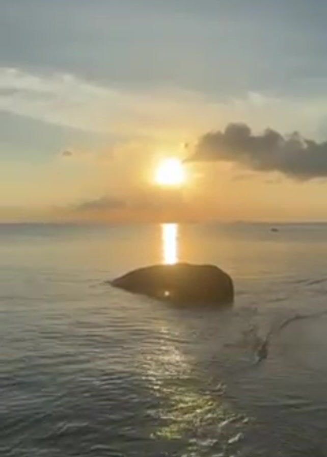 The video captures a serene sunrise scene at a tropical seaside location. The sun shines brightly above the horizon, casting a golden glow on the calm water. In the foreground, a large rock sits in the water near the shore, with gentle waves lapping around it. As the video pans slightly, it reveals a concrete pier or walkway lined with palm trees and small, open-air structures. People are seen lounging on beach chairs, enjoying the peaceful morning atmosphere. A man walks along the pier, casually dressed. The overall setting suggests a tranquil and relaxed vacation spot.