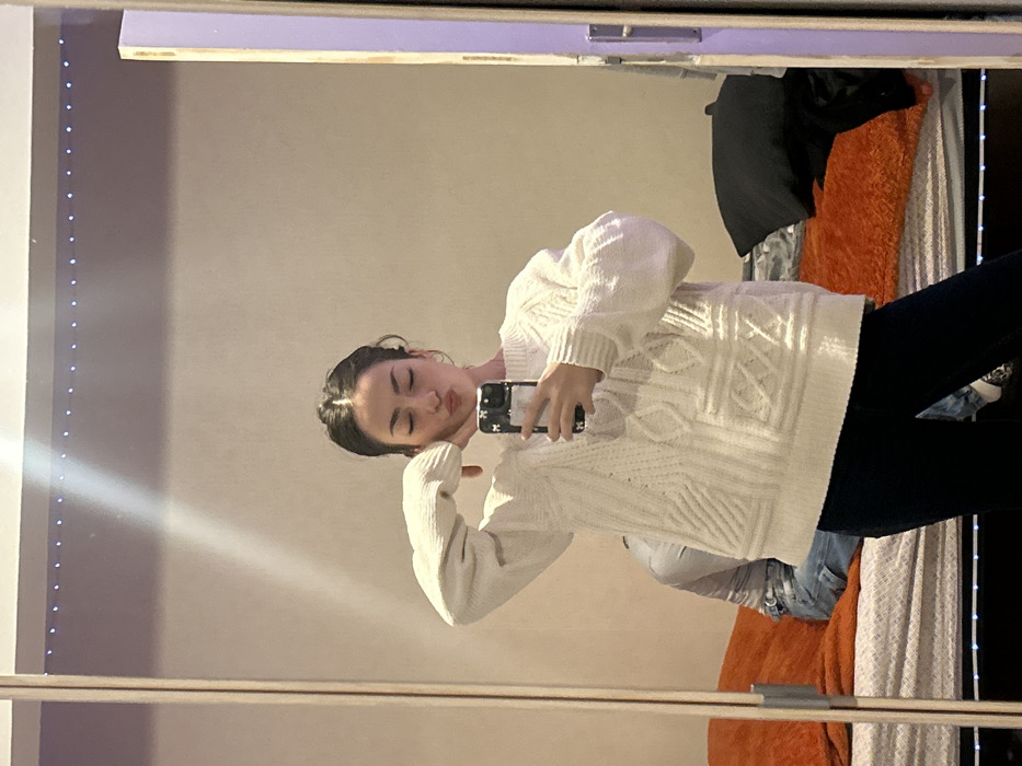 The image depicts an indoor mirror selfie taken in a residential setting in Strasbourg, France. A young adult female, with dark hair parted in the center and pulled back, stands reflected in a large rectangular mirror. She wears an oversized white cable-knit sweater and dark, form-fitting pants. Her left hand is raised, with fingers curled near her left cheek, and her lips are puckered in a kiss pose, eyes mostly closed. She holds a smartphone with a black and white patterned case in her right hand, taking the photograph. Behind the female subject, to her left in the reflection, a second individual is partially visible, seated on a bed. This individual wears a light grey long-sleeved shirt and light blue jeans; their head is not visible. The bed is covered with an orange blanket or throw over a white and light grey patterned sheet. A black pillow rests on the bed to the right of the seated individual. The room's wall is a light, neutral color. A string of small, purple-hued lights is visible horizontally along the top edge of the reflected wall. A bright light reflection is prominent in the upper center of the mirror. A light purple/lavender vertical structure, consistent with a door frame or closet edge, borders the mirror on the right side.