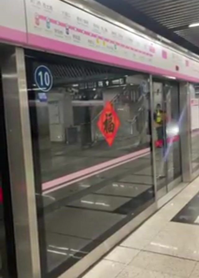 subway station in China, most likely during or around the Chinese New Year celebration. The station's platform screen doors are prominently displayed, decorated with a red diamond-shaped paper decoration featuring the Chinese character "福" (fú), which means "good fortune" or "blessing." The doors are numbered "10." Above the doors, there's a pink-colored line map of the subway line, with station names written in Chinese. A subway train arrives behind the platform screen doors. The station floor is tiled. There is no further information visible.