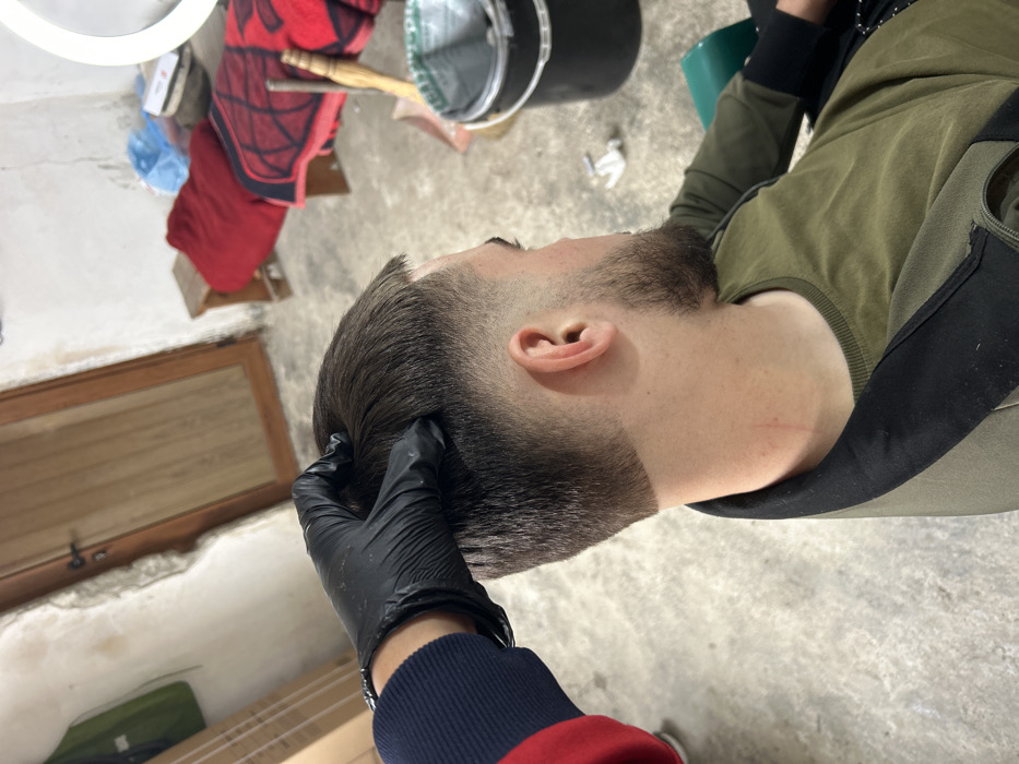 This image depicts a haircut service taking place in an indoor, semi-finished space located in the city of Hvostiane, Bulgaria