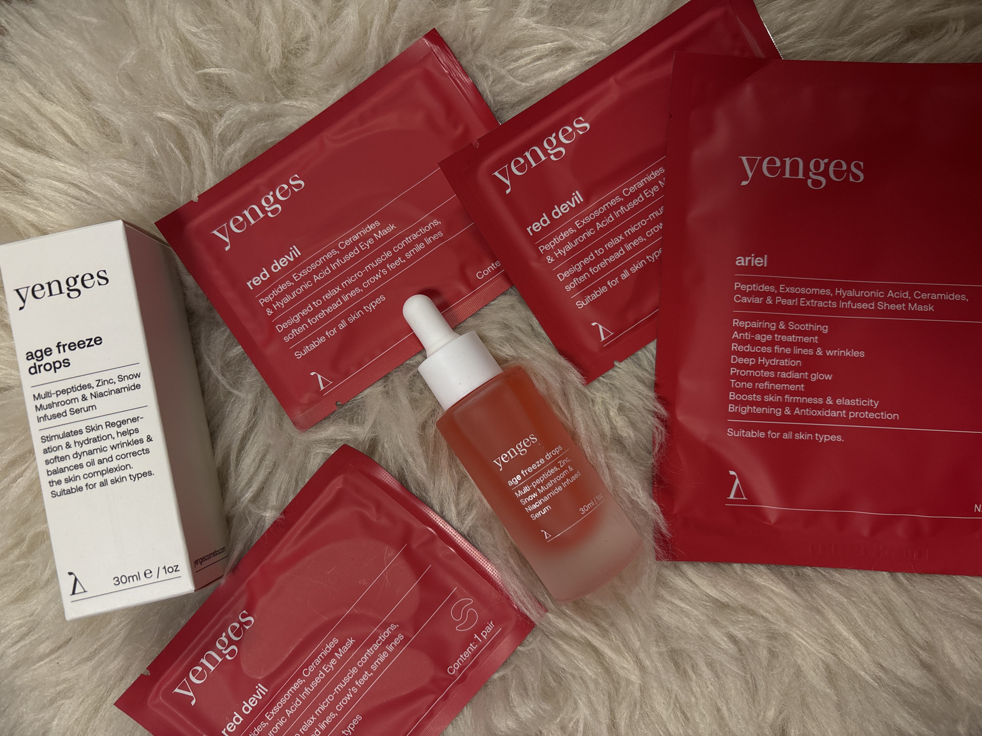collection of skincare products from the brand "yenges" arranged on a soft, white, furry surface. The products include: 1. A white box labeled "yenges age freeze drops," a serum containing multi-peptides, zinc, snow mushroom, and niacinamide. The box indicates a volume of 30ml/1oz and lists benefits like skin regeneration, hydration, and wrinkle softening. 2. A frosted glass bottle with a dropper, also labeled "yenges age freeze drops," indicating it contains the same serum as the white box. The volume is 30ml/1oz. 3. Three red packets labeled "yenges red devil," containing peptide, exosome, ceramide, and hyaluronic acid-infused eye masks. The packets state they are designed to relax micro-muscle contractions and soften wrinkles and are suitable for all skin types. 4. A red packet labeled "yenges ariel," containing a peptide, exosome, hyaluronic acid, ceramide, caviar, and pearl extract-infused sheet mask. It lists benefits like repairing, soothing, anti-aging, deep hydration, tone refinement, and brightening. There is no information available that indicates the image was taken in Cheshnegirovo, Bulgaria.