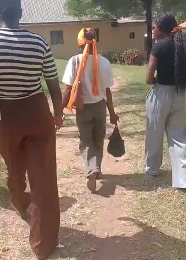 Three people walk away from the camera on a dirt path near a building. One person wears a striped shirt and brown pants, the second wears a white shirt, khaki pants, and an orange head wrap, and the third wears a black shirt and gray pants. The second person carries a brown bag over their shoulder and a small black bag in their hand. The third person holds papers in their hand. A building with a silver roof can be seen in the background.