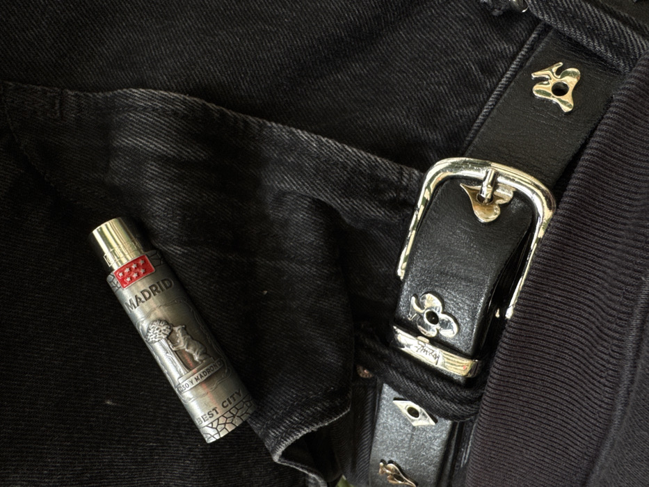 - "A close-up, top-down view depicts a black leather belt resting on black denim fabric, likely jeans, accompanied by a metallic cylindrical object" by FM-GUIsO2, licensed under CC BY 4.0