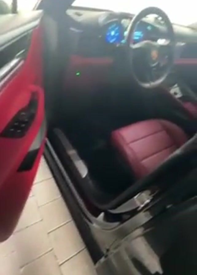 The camera pans from the open door of a black car, showing the red interior. The interior includes red leather seats, a black dashboard with a digital display, and a red-lined door with black electronic controls. The car is parked on a light-colored tiled surface, likely inside a garage or showroom.