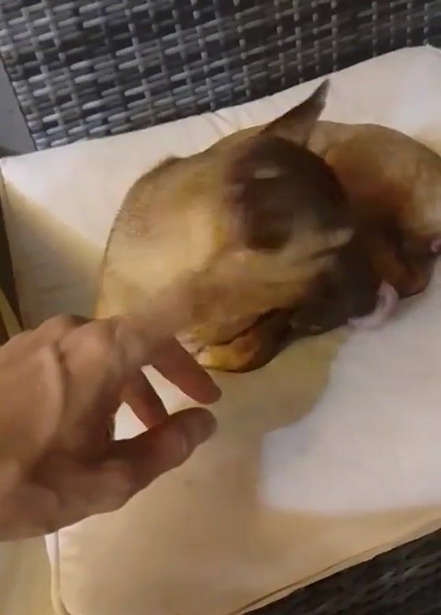 A person’s hand is seen petting a small, brown dog that is lying on its side on a white cushion