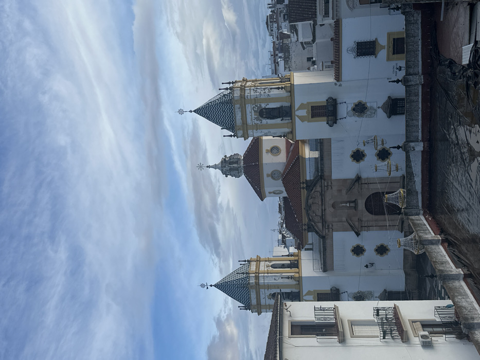 An elevated, daytime view captures the Church of Nuestra Señora de la Merced in Ronda, Spain, beneath a partly cloudy sky. The prominent central structure features a white stucco facade with yellow ochre trim. It includes two symmetrical bell towers topped with pyramidal roofs adorned in a blue, white, and ochre chevron tile pattern, each surmounted by a decorative finial or cross. A central, reddish-brown tiled dome is topped by a smaller white cupola and a cross. The church's main entrance displays an ornate, classical-style portal with a statue of a robed figure positioned within a niche above the doorway. In the immediate foreground, a dark, flat rooftop, possibly covered with a tarp, appears wet and reflects ambient light. A low, gray concrete parapet wall defines the edge of this rooftop. Several large, ornate chandelier-style decorative light fixtures, composed of gold and white elements, are suspended at various heights between the foreground rooftop and the church facade. To the left, a multi-story, white residential building with dark balconies and an external air conditioning unit partially obscures the left bell tower. The background reveals a dense urban landscape of white-washed buildings with reddish-brown tiled roofs, typical of a Spanish town, receding into the distance under the soft light. No individuals are visible, and no overt actions are occurring.