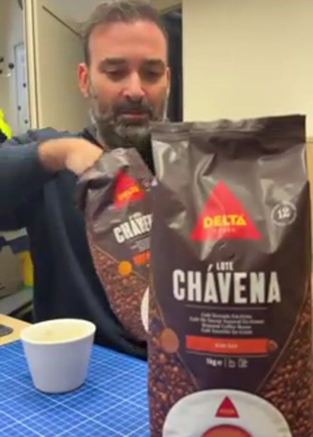 A man with dark hair and a beard stands in front of a table covered with a blue grid-patterned mat. He's holding two large bags of Delta Lote Chavena coffee. There's a small white cup with coffee in front of him. He puts a coffee bean in his mouth and then takes a sip of coffee from the cup. A green exit sign is visible on the wall behind him.
