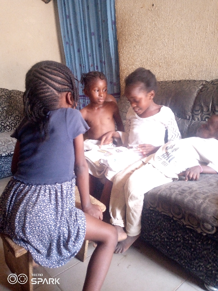 An indoor scene in Ajaokuta, Nigeria, depicts four children within a room featuring a textured light-colored wall and blue patterned curtains