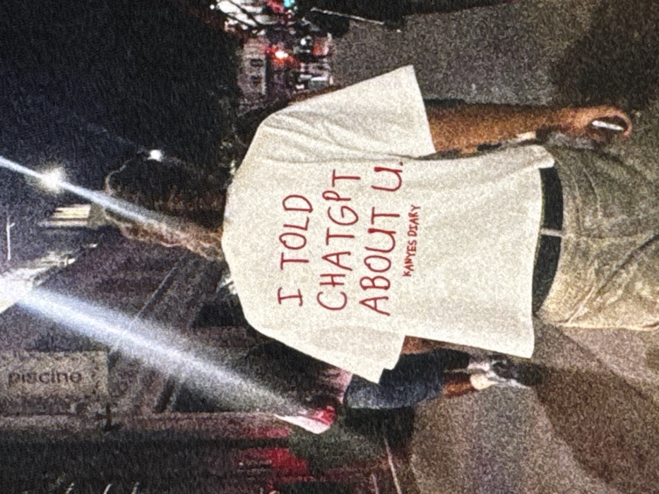 The scene depicts a nighttime urban environment in Chișinău, Moldova, observed from a slightly elevated, rear-facing perspective of a primary subject. A person, viewed from behind, walks away from the camera on a paved street or sidewalk. This individual wears a white, short-sleeved t-shirt with the phrase "I TOLD CHATGPT ABOUT U." printed in red capital letters across the back, and "KANYES DIARY" in smaller red text below it. They have long, dark, textured hair extending down their back and wear light-colored, possibly beige, trousers with a dark belt. The person's right hand, extended slightly, holds a small white cylindrical object. To the immediate left of the central subject, another individual is partially visible from the lower torso down, also walking away. This person wears a pink top and dark lower garments, likely shorts or trousers, paired with white socks and dark footwear. The ground surface is textured and appears gritty. The background features darkened multi-story buildings lining the street. Multiple artificial light sources illuminate the scene, including a prominent bright white light high above and to the left, casting a strong diagonal beam with lens flare across the upper left and central portions of the image. Other blurred lights, including red and white points, are visible further down the street, suggesting distant vehicle lights or building illumination. A vertical sign on a dark structure to the left of the frame displays the word "Piscine" oriented downwards.