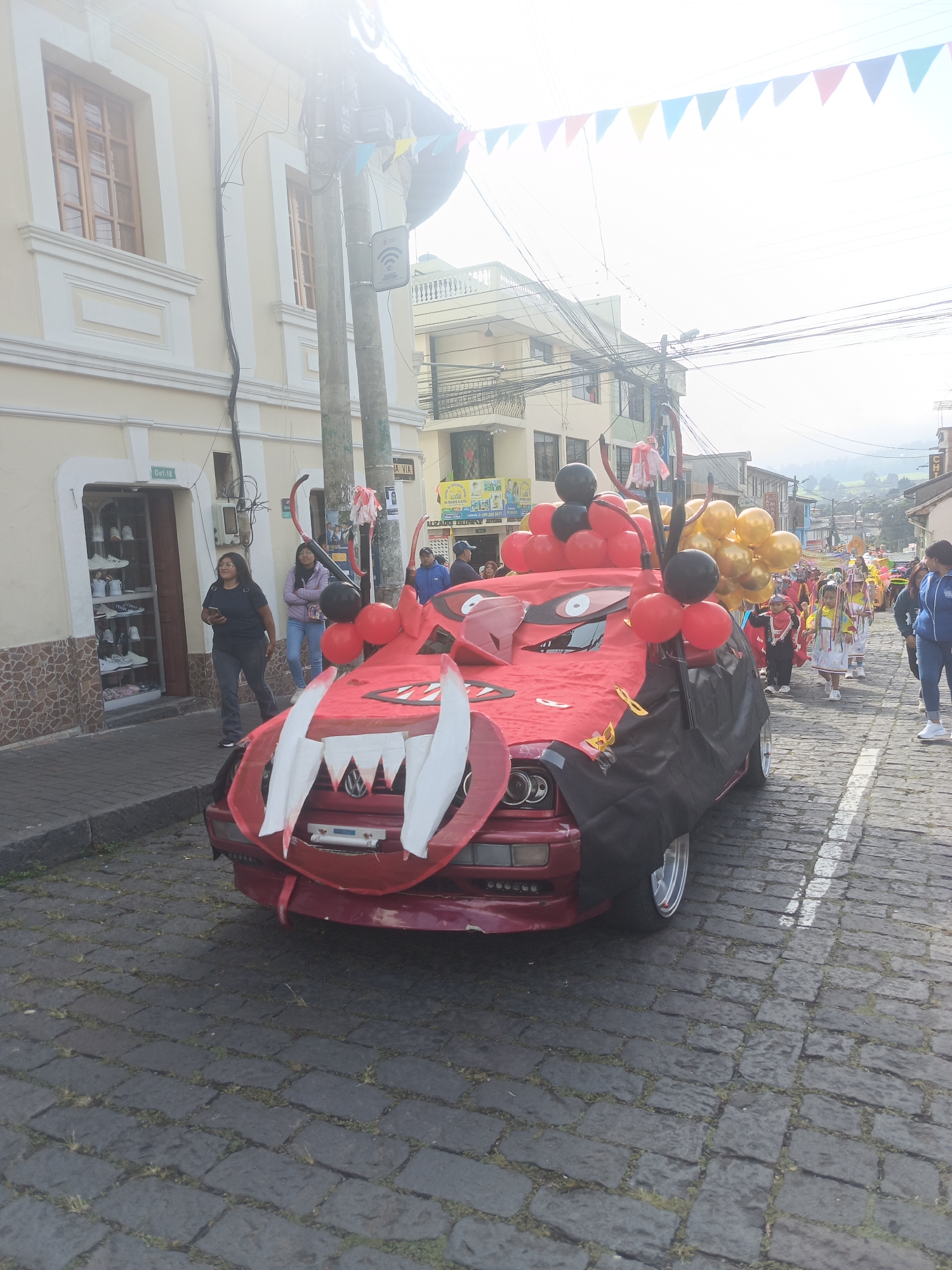 The image depicts a street scene in Amaguaña, Ecuador, during what appears to be a parade or festive event