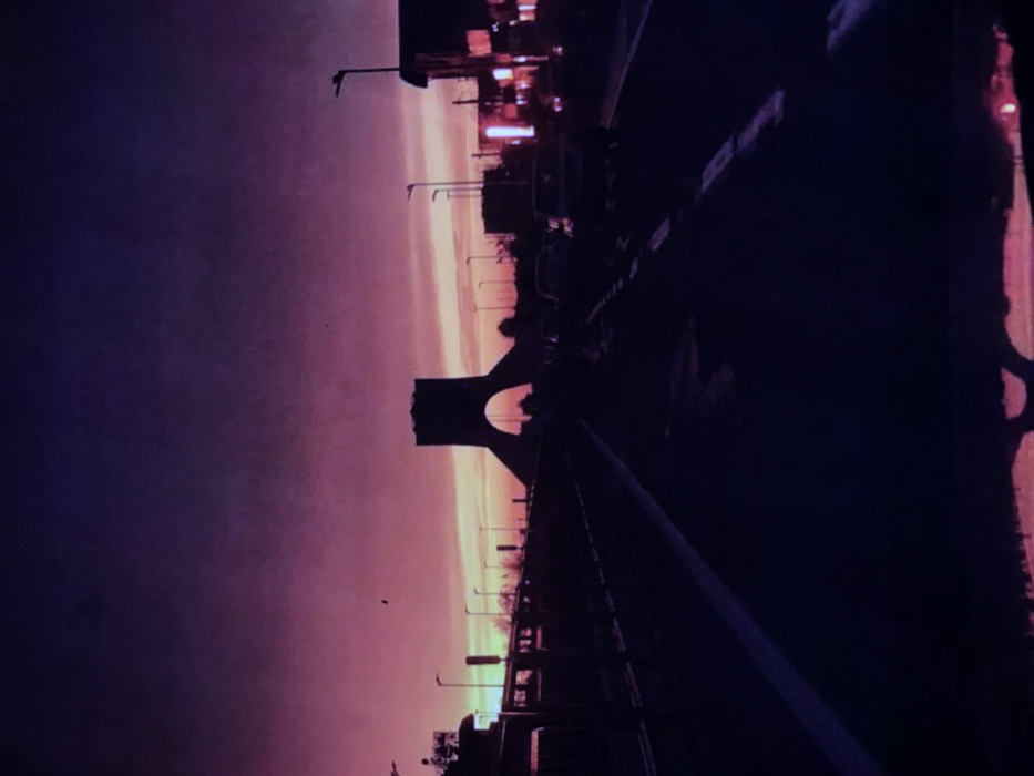The image displays an urban street scene at sunset in Lukovit, Bulgaria. The sky transitions from deep purple at the top to vibrant magenta and orange-pink near the horizon. In the foreground, a dark asphalt road surface shows several reflective patches, suggesting the presence of water or puddles. White lane markings, including a solid line on the left and broken lines in the center, delineate traffic lanes. A partial reflection at the very bottom edge indicates the viewpoint is likely from inside a vehicle. On the left side of the road, a metal guardrail runs parallel, with silhouetted streetlights and indistinct tree-like structures visible beyond it. On the right, multiple dark vehicles are present on the roadway, suggestive of traffic. Further right, a building with internally illuminated windows casting a reddish glow is visible, along with additional illuminated streetlights. The central feature of the image is a large, dark, monumental arch structure, silhouetted prominently against the colorful sky. This structure has a broad base tapering upwards to form a distinct archway. Additional faint silhouettes of distant structures or vegetation can be observed around and behind the monument. No specific individuals are discernible within the scene.