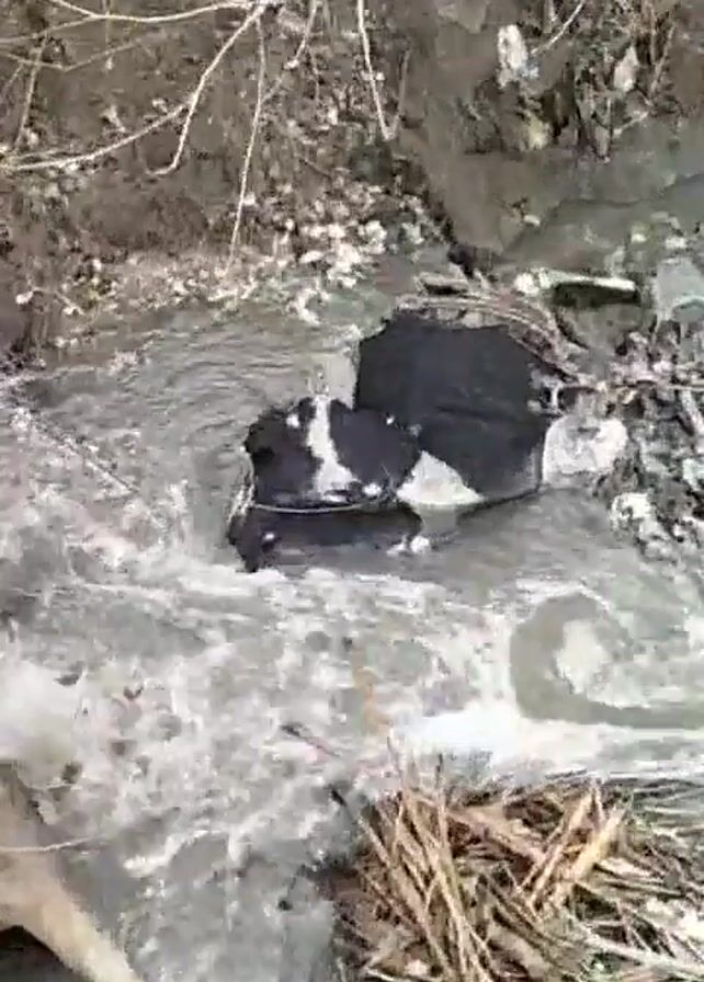 carcasses of two cows partially submerged in a stream. The stream is flowing through a muddy, overgrown area with branches and debris along the banks. One cow is black and white, and the other is a lighter color. Both appear bloated and are lying on their sides in the water. The overall scene appears unsanitary and disturbing.