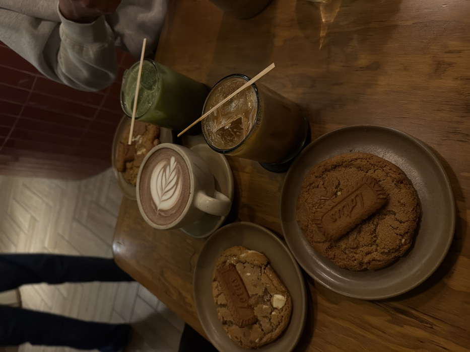 A wooden table is topped with an array of treats. There are two iced beverages, one green and one tan, each with a stir stick. A latte with latte art sits on a saucer. Two plates of cookies, each adorned with a Lotus biscuit, are also present. Portions of people can be seen, including a person in a light-colored sweatshirt and another in dark jeans. The table appears to be near a textured wall.