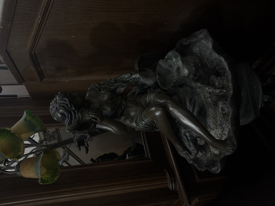 An indoor scene, dimly lit, displays a bronze statue and a decorative lamp against a dark wooden paneling and a mirror