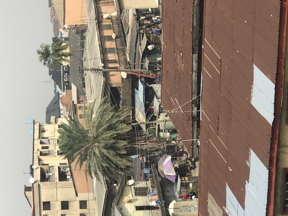 An elevated, downward-angled view captures a densely populated urban area in Unknown, Unknown, under a hazy sky. The scene is characterized by numerous buildings of varying heights and construction styles, dominated by corrugated metal roofs in shades of rust-brown and lighter grey. In the immediate foreground, multiple corrugated metal roofs are visible, primarily rust-colored, with some sections replaced by or constructed from lighter grey material. A simple antenna structure is affixed to one of these roofs, slightly left of center. The midground features a cluster of multi-story buildings and ground-level activities. A large, prominent palm tree with dense green fronds stands centrally, partially obscuring a light-colored multi-story building behind it. This building, located upper-left, exhibits multiple balconies with clothes hanging to dry and several blue satellite dishes on its rooftop. Below the large palm tree, at ground level, a market area is active. Multiple individuals are present, engaged in various unidentifiable activities around makeshift stalls. One stall is distinguished by a purple and white striped umbrella providing shade. Utility poles supporting numerous overhead electrical wires traverse the scene. To the right of the palm tree, a multi-story building features a detailed wooden balcony railing and multiple beige satellite dishes mounted on its exterior. A bright red ladder leans against a structure further right in the midground. Smaller, single-story structures with corrugated roofs are interspersed throughout this area. The background reveals additional buildings with dark-colored gabled and flat roofs, extending towards a distant hazy horizon. A smaller palm tree is visible in the upper right background. A faint outline of a power line tower structure can be discerned on the distant horizon, near the center-right.