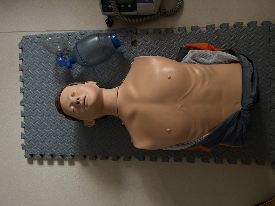A CPR mannequin lies on a gray interlocking foam mat