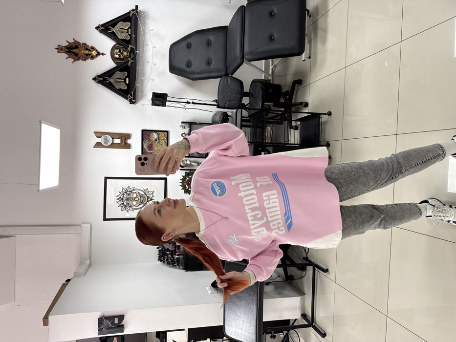 An indoor scene in what appears to be a tattoo or piercing studio located in Rostov-on-Don, Russia. The primary subject is a young adult female with red hair styled in two ponytails, standing centered in the frame while capturing a mirror selfie with a light-colored smartphone held in her right hand. She is observed holding a section of her hair with her left hand, looking towards the phone with a slight smile. The female is wearing an oversized pink and white sweatshirt with the reversed text "MOTORCYCLE OF GAMES" printed on the front in white and light blue. She is also dressed in light grey, acid-wash skinny jeans, white ankle socks, and white sneakers with black accents. A silver cross pendant on a chain is visible around her neck, and a tattoo is present on her left wrist. The background features white walls and a light-colored tiled floor. To the left, a dark-colored shelving unit holds numerous small bottles, consistent with tattoo inks. A black task table with a grey surface is also present. To the right, two black leather chairs are visible: one is a reclining procedure chair, and the other is an adjustable office-style stool. A black wheeled trolley and a black stand supporting a rectangular light fixture are positioned near the chairs. Wall decorations include several framed artworks depicting a stylized skull with floral motifs, abstract designs, moths, and a skull sculpture. Wooden plaques and a string of decorative lights are also mounted on the wall. An overhead rectangular LED light fixture is affixed to the ceiling.