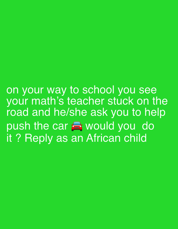 The image is a digital graphic featuring a solid, vibrant green background. White sans-serif text is centrally aligned across the lower six lines of the frame. Embedded within the text is a red car emoji (🚗). This textual content describes a hypothetical scenario: on a road in Ojo, Nigeria, a student encounters their mathematics teacher, whose vehicle has become immobilized. The teacher then requests the student's assistance to push the car. The graphic subsequently poses a question to the viewer, "would you do it?", and provides an instruction: "Reply as an African child." The depicted scene encompasses two primary individuals (a student and a teacher), an inoperable car, a road, and the implied setting of a school commute. The central action involves a request for aid and the potential manual propulsion of the vehicle.