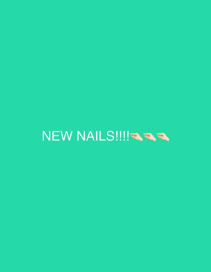 The image displays a digital graphic with a solid, vibrant teal-green background. Centered horizontally, white uppercase text reads "NEW NAILS!!!!". To the immediate right of the exclamation points, three identical hand emojis are arranged horizontally. Each emoji depicts a light-skinned hand with fingers slightly curled, suggesting a delicate gesture or display. The fingernails on these emojis are colored a light teal or mint green, complementing the background hue. There are no people, other subjects, physical objects, or environmental context depicted, making any specific location, including in the city of Valencia, Spain, undeterminable from the image content.