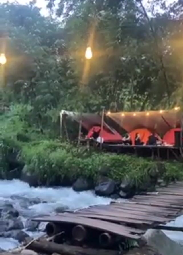 scenic outdoor campsite nestled beside a flowing river. In the foreground, a simple, possibly makeshift, wooden bridge spans the river, the water rushing over smooth, dark rocks. On the opposite bank, a raised wooden platform supports several orange tents sheltered under a tarp, lit by string lights. People are visible inside or near the tents, seemingly relaxing. The background is filled with lush green trees and vegetation, partially obscured by the early evening light.