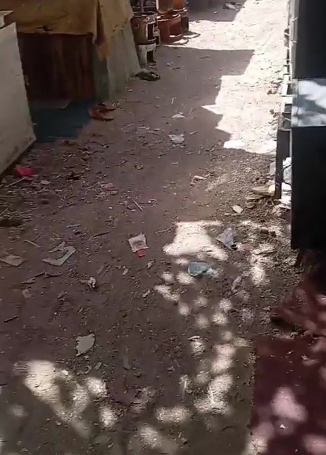 bustling alleyway, with a man walking while carrying a metal bucket. The alley is narrow and cluttered with various items, including metal drums, buckets, and scraps of paper and trash scattered on the ground. Some people are seen sitting and working. The alley is shaded in some areas, with bright sunlight in others. The camera follows the man with the bucket as he walks, providing a view of the surroundings. The sounds of work and activity can be heard in the background.