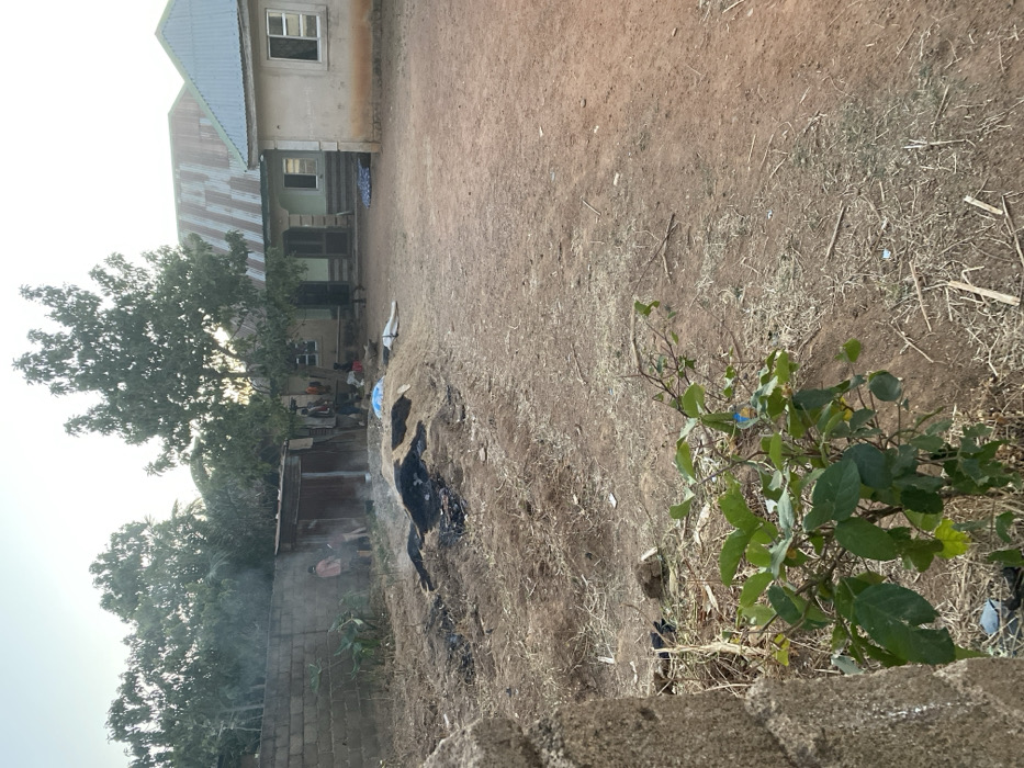 A rural scene presents a house with a corrugated iron roof and a concrete facade. A large, leafy tree partially obscures the view of the house. In the foreground, a patch of burned ground emanates smoke. People gather near the house. Lush green foliage grows in the immediate foreground, contrasting with the bare earth and dry vegetation. The sky appears overcast.