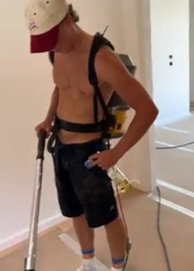 A shirtless man in a baseball cap and dark shorts stands in a room with a vacuum cleaner strapped to his back. He holds the vacuum’s wand and hose in his left hand and a plastic bottle in his right hand. The room has white walls and a beige-colored floor covered with tape. A doorway leads to another room, which also has taped floors. The man looks down at the vacuum wand, then looks up and smiles.
