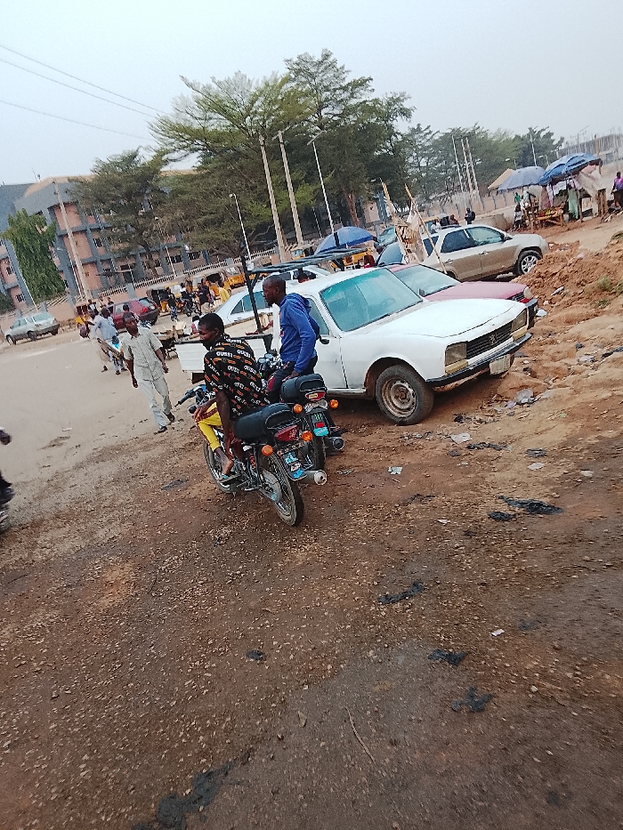 A street scene shows a dirt road with parked vehicles and pedestrians. A yellow and black motorcycle with two riders is in the foreground. Behind it, a white sedan and a pink sedan are parked. Several people are walking on the road. In the background, there are buildings, trees, and power lines. A building with multiple floors is visible on the left. Several vendor stalls with people under them are present on the right.
