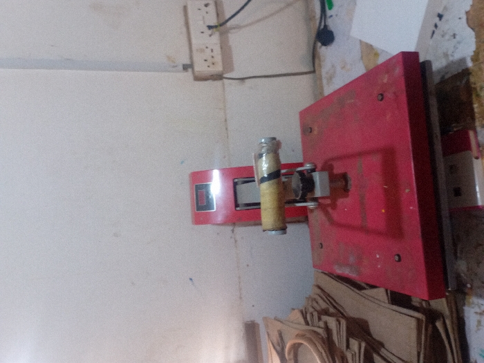 The image displays an indoor workspace, possibly in Jos, Nigeria, centered on a red heat press machine