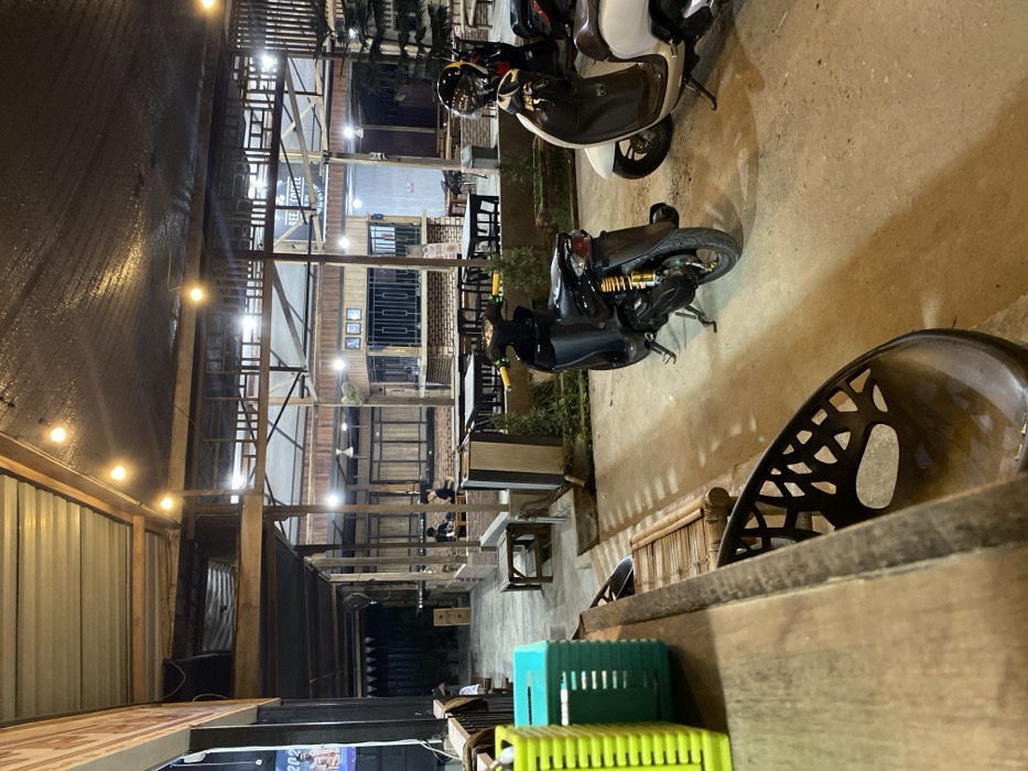 An overhead view captures a semi-open-air dining establishment at night in Seuneubok Teungoh, Indonesia. The scene is illuminated by numerous string lights and ceiling fixtures, casting shadows across a concrete and unpaved ground. The establishment features a rustic design with wooden posts, beams, and slatted walls supporting a combination of corrugated metal roofing and dark fabric awnings. In the immediate foreground, to the left, a wooden counter holds two plastic storage bins, one bright yellow-green and one teal. A dark, decorative chair with a tree-like pattern on its back is partially visible, alongside a segment of a bamboo bench. The midground features two motor scooters parked on the concrete. A black scooter with yellow rear suspension accents and yellow handlebar grips is centrally positioned, facing left. To its right, a white or cream-colored scooter with a dark helmet on its seat is partially visible, facing right. Beyond the parked scooters, a dining area extends into the background. It is furnished with multiple square and rectangular tables, some black, some wooden, accompanied by chairs. To the right, a counter area with brickwork and wooden paneling is visible, above which a sign partially displays "REE COFFEE." Another partial sign with "202..." is visible on the far left. Several individuals are present in the background. Two people are seated at a table on the left, while another person stands further back on the far left. Small planter boxes with vegetation are interspersed throughout the dining space.