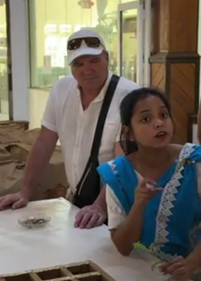A young woman in a blue sari with white lace stands behind a white counter, gesturing with her right hand and speaking with her mouth open. Behind her and to her left stands an older man in a white short-sleeved shirt, a white baseball cap, and sunglasses. He has a black bag slung across his chest. He looks at the woman while she speaks and then scratches his chin with his right hand. In front of the pair is a wooden tray with nine compartments, each containing what appears to be tea leaves. Small round dishes containing tea leaves also sit on the counter. Large brown paper bags are visible on the counter behind the man. A glass window and door are behind the man. A wooden wall with a decorative light fixture is to the right.