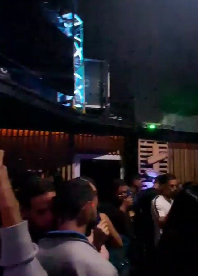 interior of a crowded, dimly lit nightclub. Many people are visible, mostly from the back, suggesting they are facing a stage or DJ area. The lighting is dynamic with beams of blue, green, and red lasers moving around the room. A person in the foreground holds up a cell phone, possibly recording the event. In the background, structural elements of the club are visible, including wooden paneling and various lighting fixtures. The overall atmosphere appears lively and festive.
