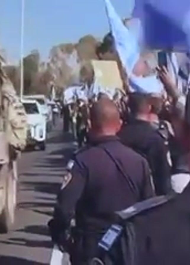 procession on a road. The procession includes military vehicles followed by white pickup trucks. People are lining the road, many holding Israeli flags and other flags. Some people are raising their hands in the air. There are police officers present, wearing dark blue uniforms, facing towards the procession. The environment appears to be a road lined with trees, with a clear sky above.