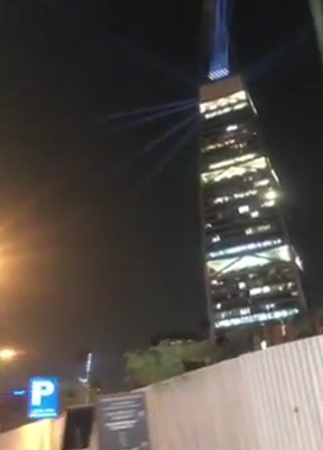 The video, shot at night, focuses on a tall building illuminated with blue laser beams emanating from its upper portion